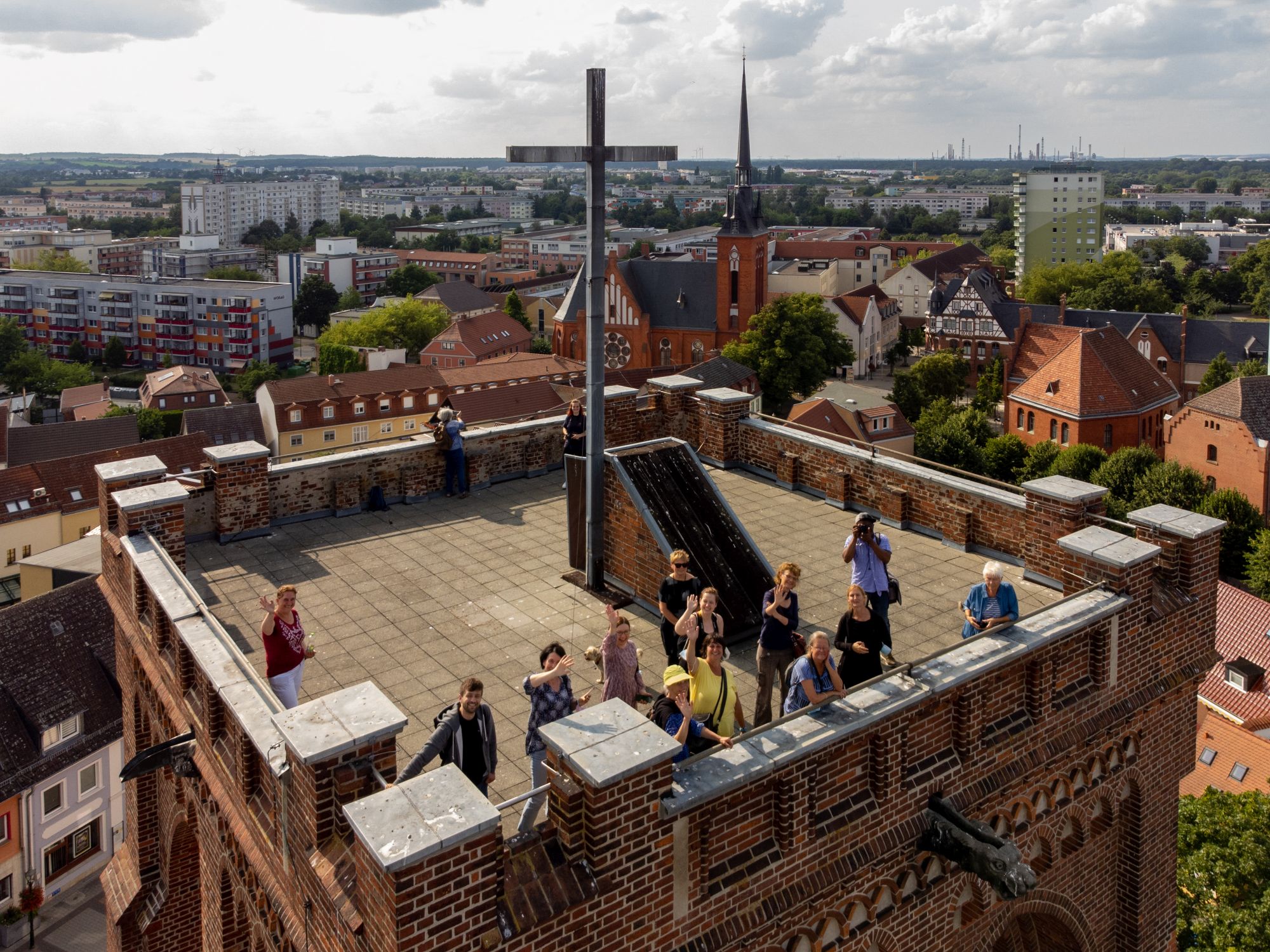 Auf dem Dach der Evangelischen Kirche mit kleinem geschichtlichen Überblick von Anke Grodon/Stadtmuseum