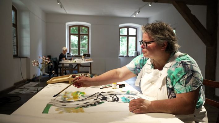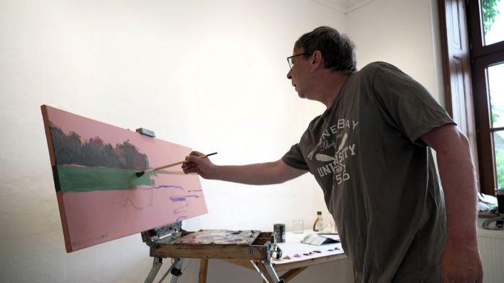 Künstler malt eine Landschaft in einem Schwedter Atelier. Bild: RBB