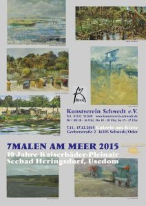 “7 MALEN AM MEER“ Ergebnisse des 14. Kaiserbäder-Pleinairs 2018, Seebad Heringsdorf, Usedom Vernissage 16.02.2019, 15 Uhr, Galerie am Kietz, Gerberstr.2, Schwedt Ausstellung 16.02. bis 28.03. 2019 In der Zeit vom 5. bis 13. Mai 2018 trafen sich wieder 7 von einer Fachjury ausgewählte Künstlerinnen und Künstler im Seebad Heringsdorf zum gemeinsamen Malen am Meer. Zum …